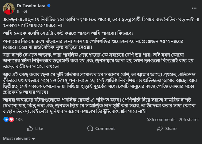 নির্বাচিত হলে সৎ থাকা সম্ভব হলেও স্বতন্ত্র প্রার্থী হিসেবে রাজনৈতিক ‘বড় ভাই’ বা ‘নেতা’দের দাপট থামানো যাবে কি না—এমন প্রশ্নের জবাবে নিজের অবস্থান স্পষ্ট করেছেন ঢাকা-৯ আসনের স্বতন্ত্র প্রার্থী তাসনিম জারা। তিনি বলেছেন, অন্যায়ের ঘটনাগুলোকে পাবলিক রেকর্ডে পরিণত করাই হবে তার মূল লড়াইয়ের পথ।