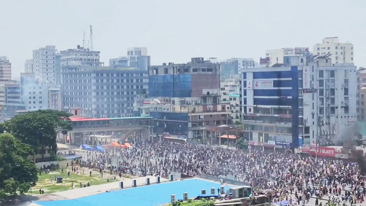 সংঘর্ষের সময় সাউন্ড গ্রেনেড ও টিয়ারশেল নিক্ষেপ করে পুলিশ ও র্যাব। আন্দোলনকারীরা হাউজ বিল্ডিং থেকে রাজলক্ষী মোড় পর্যন্ত সড়কে অবস্থান করছেন।