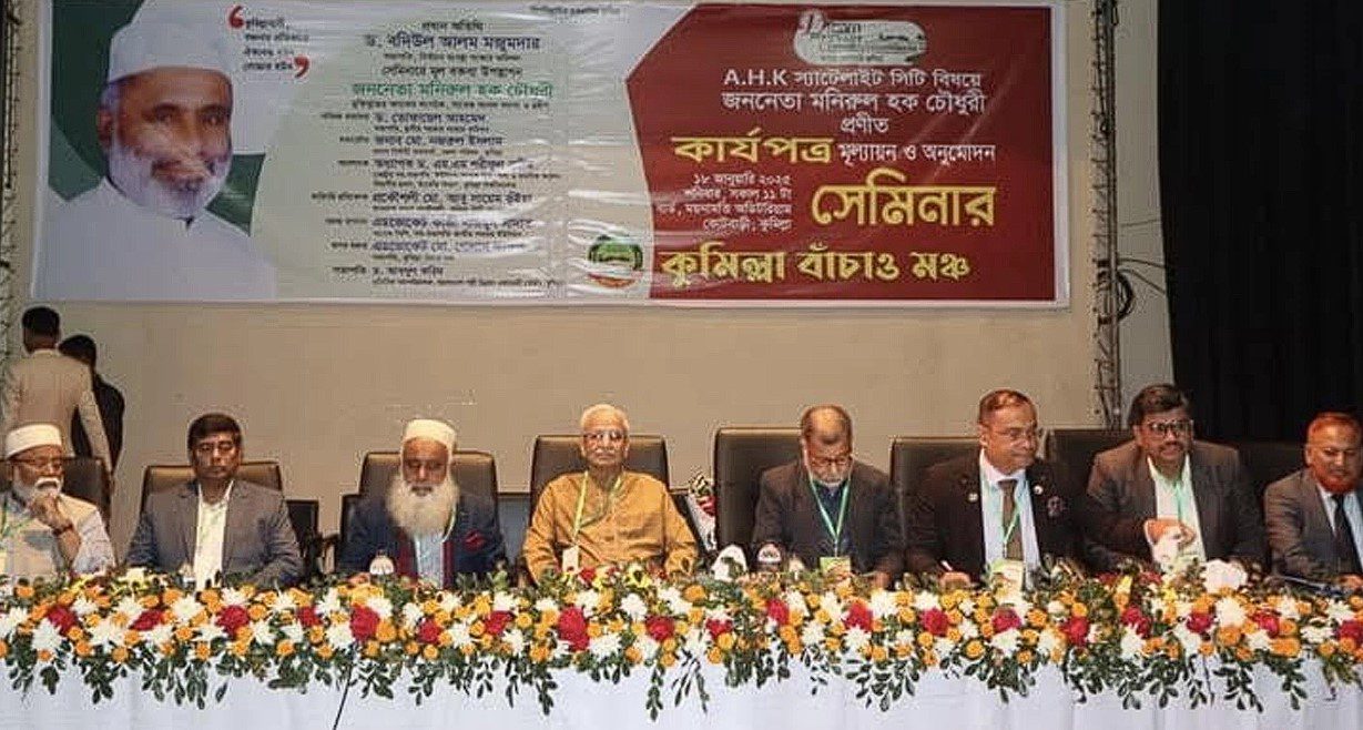 বার্ডের ময়নামতি অডিটোরিয়ামে “এএইচকে স্যাটেলাইট সিটি বিষয়ে কার্যপত্র মূল্যায়ন ও অনুমোদন” শীর্ষক সেমিনারের আয়োজন করে স্থানীয় সংগঠন ‘কুমিল্লা বাঁচাও মঞ্চ’। মূল বক্তব্য উপস্থাপন করেন বিএনপি চেয়ারপারসনের উপদেষ্টা ও সাবেক সংসদ সদস্য বীর মুক্তিযোদ্ধা মনিরুল হক চৌধুরী।
