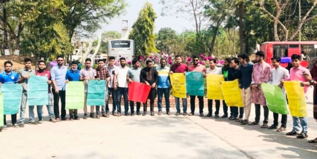 সোমবার (১০ মার্চ) বিশ্ববিদ্যালয়ের শহীদ আবদুল কাইয়ুম চত্বরে এই মানববন্ধন করেন তারা।