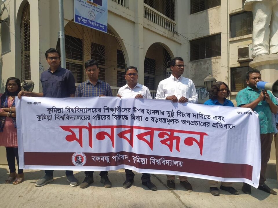 এসময় বঙ্গবন্ধু পরিষদের কার্যনির্বাহী সদস্য ও সামাজ বিজ্ঞান অনুষদের ডিন এন এম রবিউল আউয়াল চৌধুরী বলেন, বিশ্ববিদ্যালয়ের প্রধান কাজ একাডেমিক কাজ পরিচালনা করা পাশাপাশি গবেষণা করা। হঠাৎ করেই কোন কারণ ছাড়া বিশ্ববিদ্যালয়কে অস্থির করার একটা পায়তারা শুরু হয়েছে। আমরা বিশ্ববিদ্যালয়ে কোন প্রকার অস্থিরতা চাই না। কুমিল্লা বিশ্ববিদ্যালয়ের তিন শিক্ষার্থীর উপর বহিরাগতরা যারা হামলা করেছে তাদের শাস্তির দাবিতে প্রশাসন সক্রিয় রয়েছে। প্রক্টরের বিরুদ্ধে যে অভিযোগ আনা হচ্ছে তা ভিত্তিহীন। যদি তিনি অপরাধ করে থাকে তাহলে আমরা বঙ্গবন্ধু পরিষদ থেকেও ব্যবস্থা নিবো।