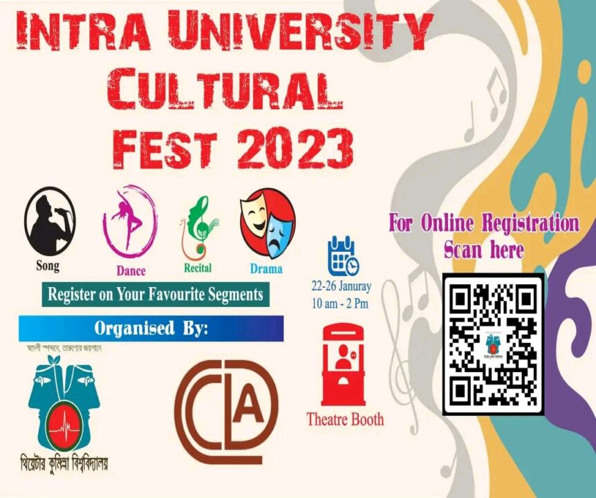 আব্দুল্লাহ, কুবি প্রতিনিধি: থিয়েটার কুমিল্লা বিশ্ববিদ্যালয় ও সেন্টার ফর কমিউনিটি ডেভলবমেন্ট এসিসটেন্টস (সিসিডিএ) এর যৌথ আয়োজনে কুমিল্লা বিশ্ববিদ্যালয়ের বিভিন্ন বিভাগের শিক্ষার্থীদের নিয়ে আয়োজিত হচ্ছে “অন্তঃবিশ্ববিদ্যালয় সাংস্কৃতিক উৎসব – ২০২৩”।