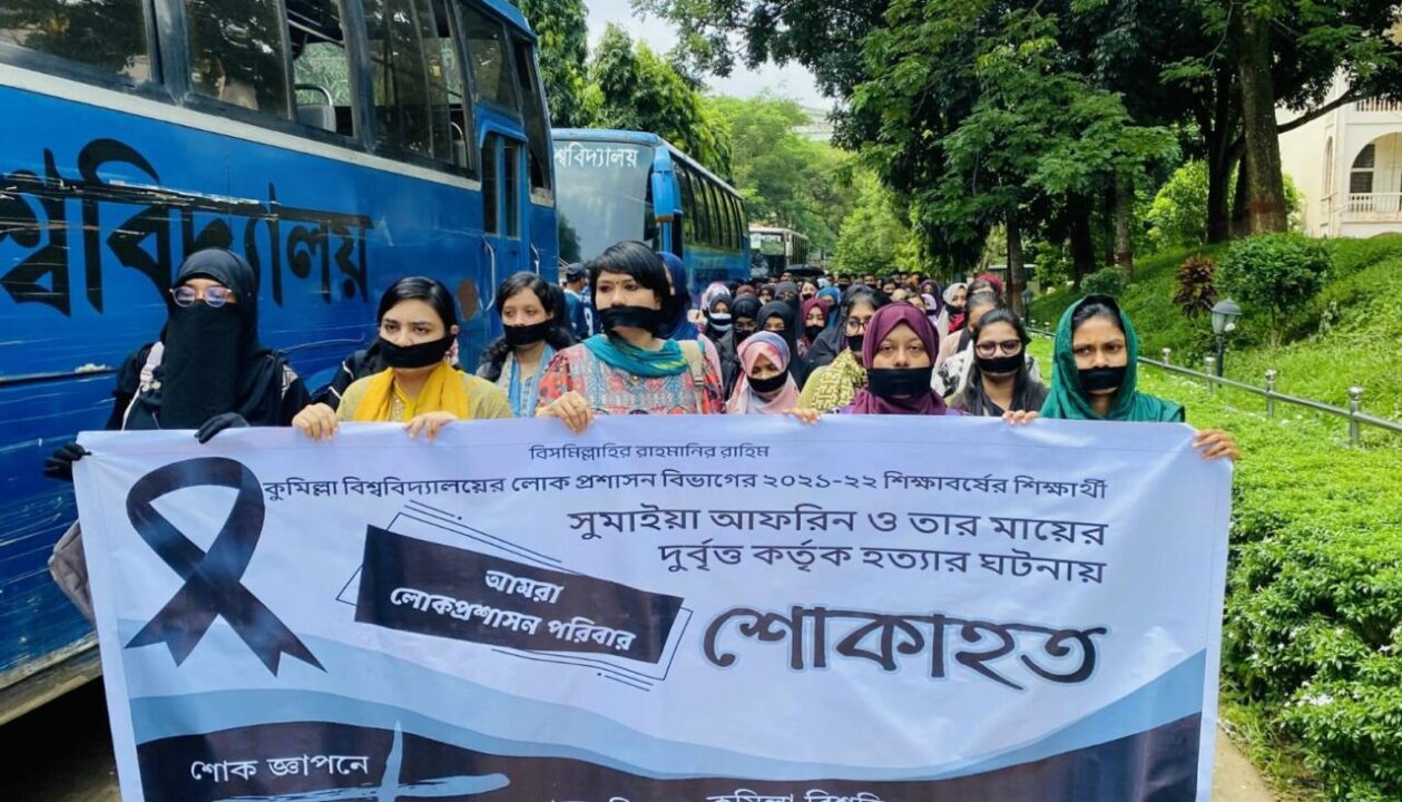 কুমিল্লা বিশ্ববিদ্যালয়ের (কুবি) লোক প্রশাসন বিভাগের ২০২১-২২ শিক্ষাবর্ষের শিক্ষার্থী সুমাইয়া আফরিন রিনথি ও তার মা তাহমিনা আক্তার ফাতেমা হত্যাকাণ্ডে শোক প্রকাশ করে মৌন মিছিল করেছে বিশ্ববিদ্যালয়ের শিক্ষক-শিক্ষার্থীরা।