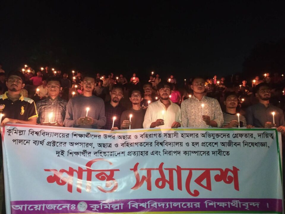 আব্দুল্লাহ, কুবি প্রতিনিধি:কুমিল্লা বিশ্ববিদ্যালয়ে (কুবি) শাখা ছাত্রলীগের সদ্য বিলুপ্ত কমিটির তিন নেতার উপর হামলাকারীদের বিচারের দাবীতে শান্তি সমাবেশ ও মোমবাতি প্রজ্বলন করেছে বিলুপ্ত কমিটির নেতাকর্মীরা।
