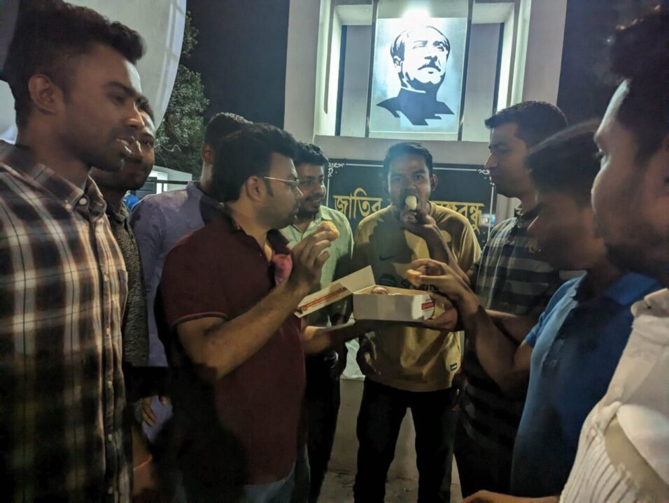 এ সময় উপস্থিত ছিলেন পদ প্রত্যাশী সাবেক সাধারণ সম্পাদক রেজা-ই- এলাহী, স্বজন বরণ বিশ্বাস, মুক্তিযুদ্ধ মঞ্চের সভাপতি আমিনুল ইসলাম, সাধারণ সম্পাদক বিপ্লব দাস এবং মমিন শুভ, ইকবাল হোসেন খান সহ বিভিন্ন নেতাকর্মী। এসময় নেতাকর্মীরা নিজেদের মাঝে এবং ক্যাম্পাস গেইটের দোকান গুলাতে মিষ্টি বিতরণ করেন।