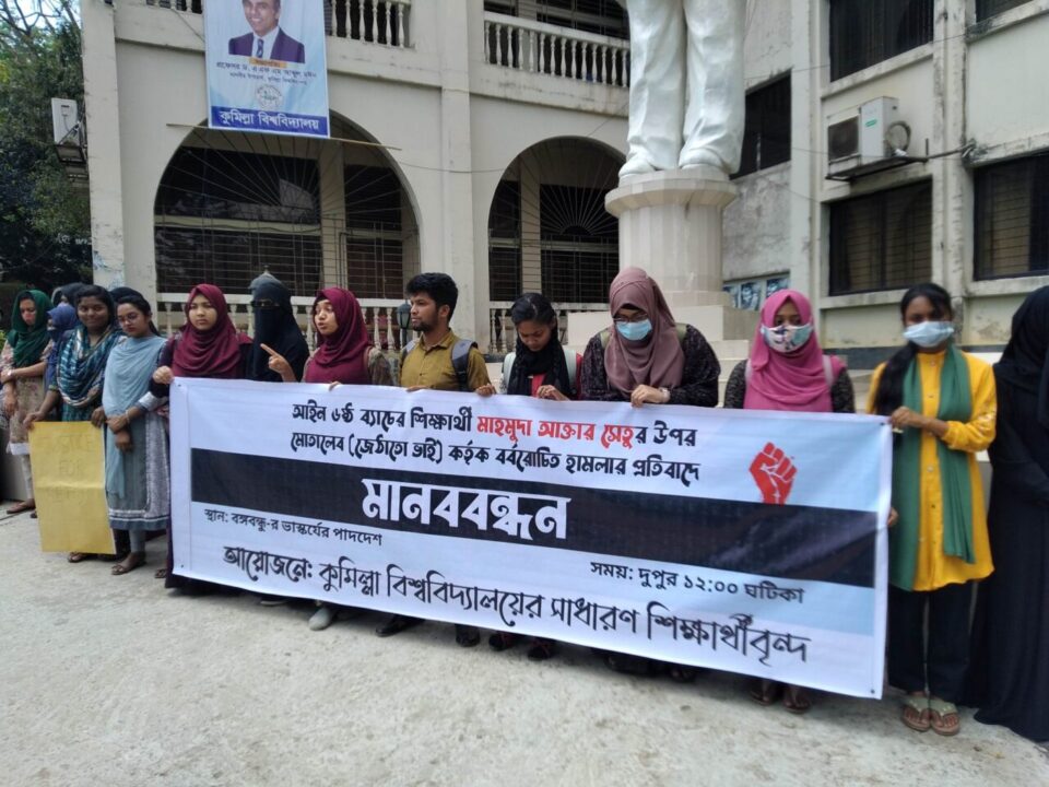 আব্দুল্লাহ, কুবি প্রতিনিধি:কুমিল্লা বিশ্ববিদ্যালয়ের (কুবি) আইন বিভাগের ষষ্ঠ আবর্তনের শিক্ষার্থী মাহমুদা আক্তার সেতুর উপর মোতালেব (জেঠাতো ভাই) কর্তৃক বর্বরোচিত হামলার প্রতিবাদে মানববন্ধন করা হয়।