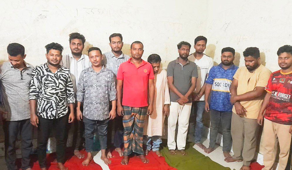 গ্রেপ্তাররা হলেন আকরাম হোসেন ওকি (২৮), মো. সাগর (২৪), মো. মহিউদ্দিন সুমন (৩২), মোহাম্মদ রাসেল হোসেন (৩০), মো. ফয়সাল (২৮), মাকসুদুর রহমান ওরফে বাবলু (৩১), আমিন খান নাহিদ (৩০), তুহিন আলম (২৮), কাজী শামসুল আলম (৫২), মোহাম্মদ মোবারক হোসেন রুবেল (৩৫), আব্দুল্লাহ আল হাদী (৩৬) ও গোলাম কিবরিয়া চৌধুরী (২৭)।