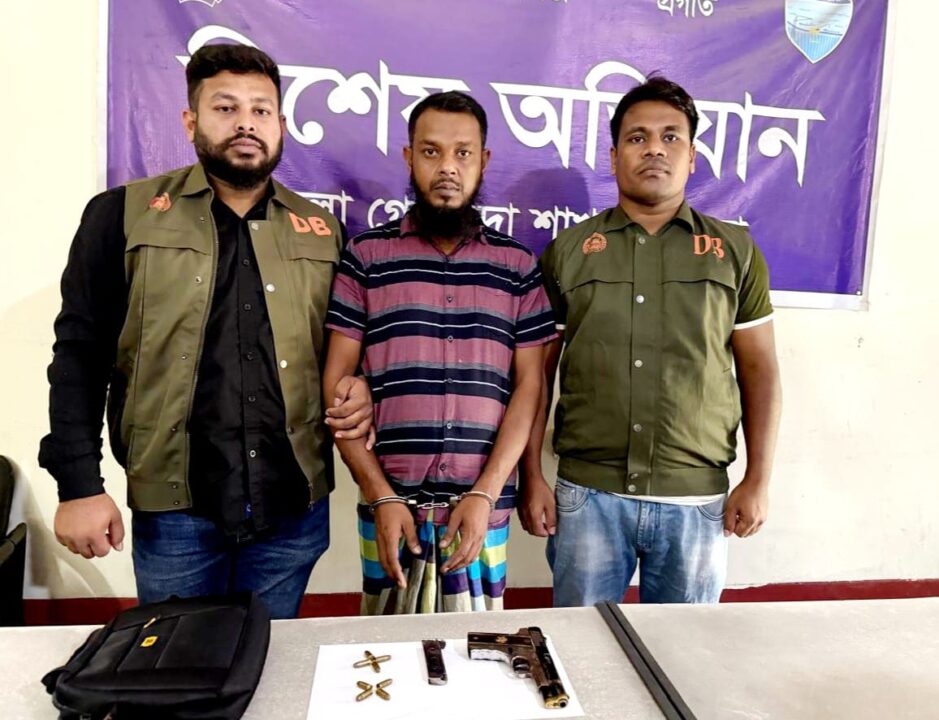 কুমিল্লায় জেলা গোয়েন্দা পুলিশের অভিযানে বিদেশী পিস্তলসহ এক যুবককে গ্রেফতার করা হয়েছে। এই সময় তার কাছ থেকে একটি ম্যাগাজিনসহ ৮ রাউন্ড গুলি উদ্ধার করা হয়েছে। মঙ্গলবার গভীর রাতে দাউদকান্দি উপজেলার চারিপাড়া চৌমুনী বাজারের সরকার মার্কেট নামক স্থান থেকে তাকে গ্রেফতার করা হয়।