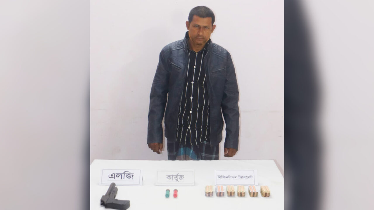 অভিযানে একটি দেশীয় অস্ত্র এল জি, ২টি কার্তুজ ও ৩০০ পিস কার্পেন্টাইল ট্যাপেন্টাডল ট্যাবলেট জব্দ করা হয়।