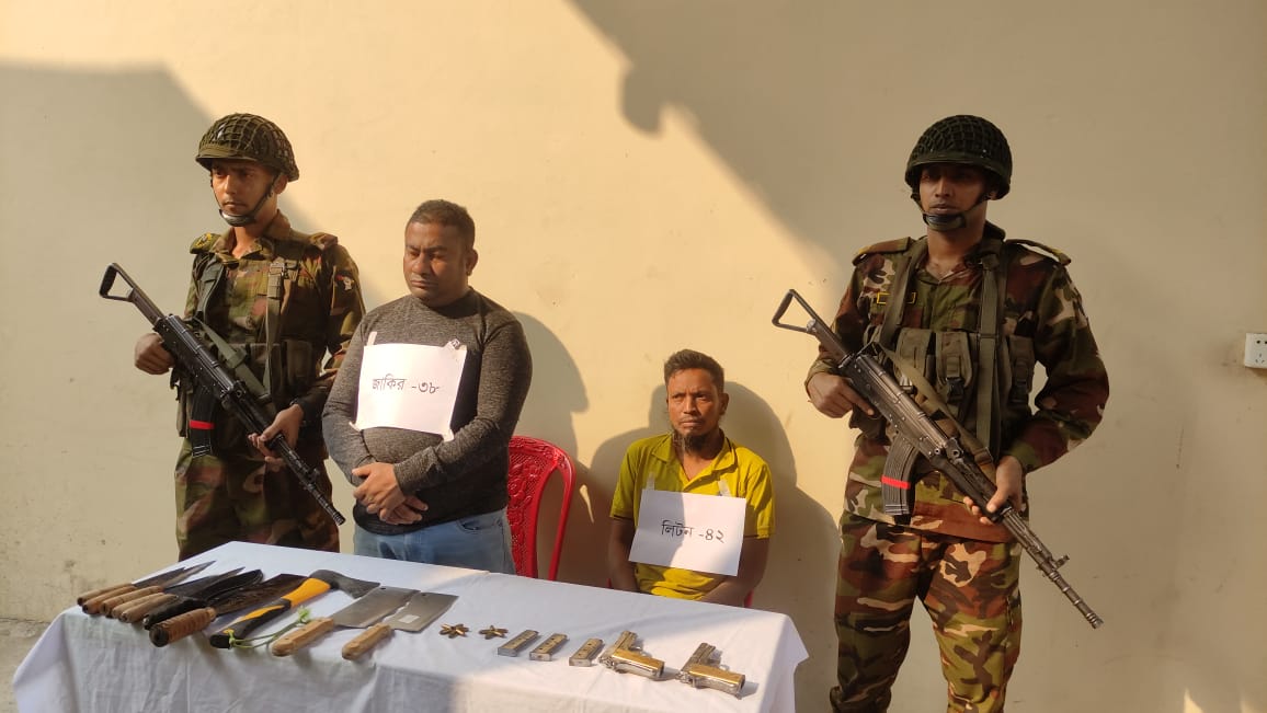 কুমিল্লায় সেনাবাহিনী অভিযান চালিয়ে জাকির (৩৮) ও লিটন (৪২) নামের দুই সন্ত্রাসীকে আটক করেছে। তাদের বিরুদ্ধে অভিযোগ, এই অস্ত্রগুলি জুলাই-আগস্টে ছাত্র-জনতার আন্দোলনে ব্যবহৃত হয়েছিল।