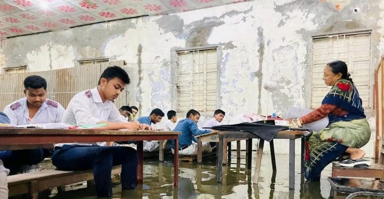 সরেজমিনে দেখা যায়, পরীক্ষা কক্ষের মেঝেতে জমে থাকা নোংরা পানির মধ্যেই শিক্ষার্থীরা খাতা লিখছে। অনেকের পোশাক ভিজে যায়। খাতা ও প্রশ্নপত্র ভিজে যাওয়ার শঙ্কায় উদ্বেগে ছিল পরীক্ষার্থীরা।