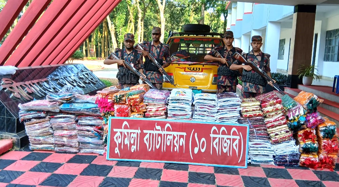 কুমিল্লায় ৬৮ লাখ টাকার ভারতীয় শাড়ি ও শাল আটক করেছে বিজিবি