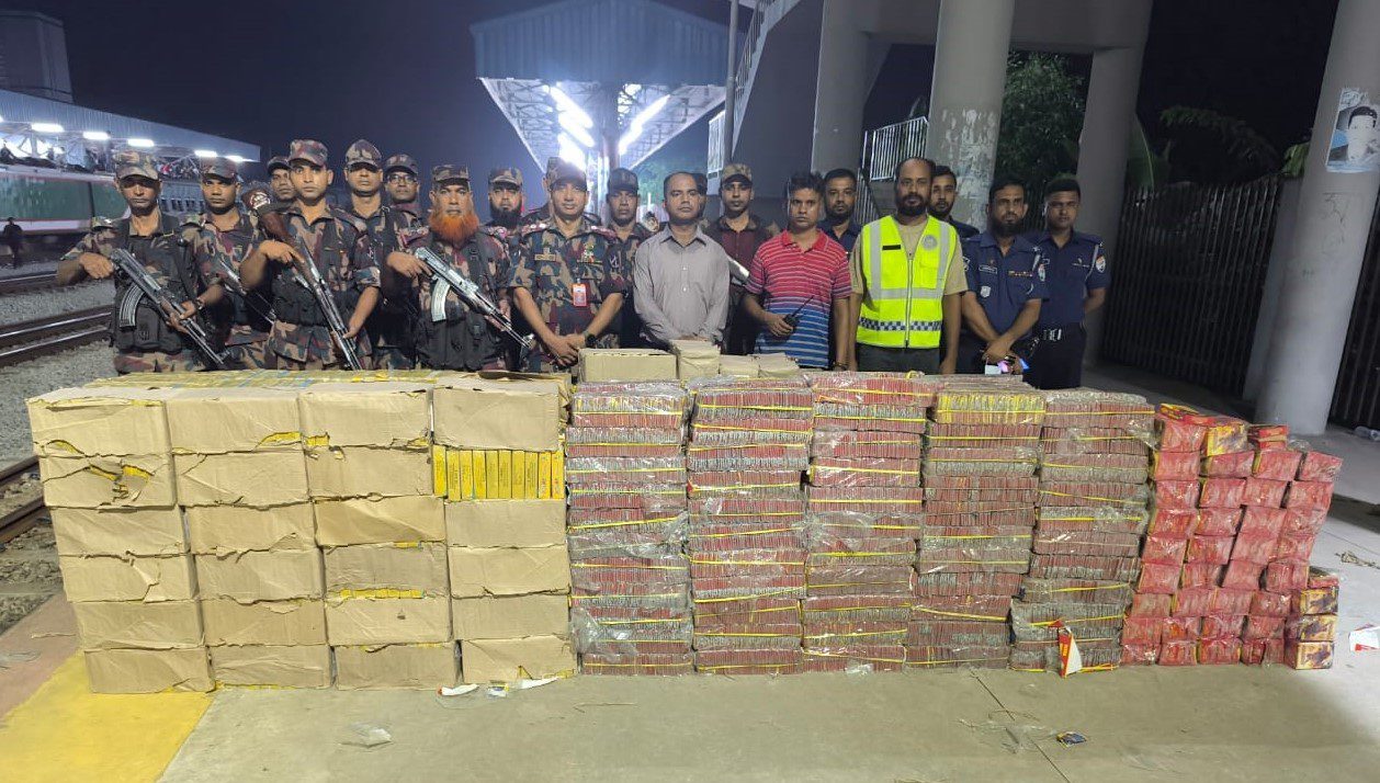 কুমিল্লা জেলার রসুলপুর রেলওয়ে স্টেশনে বিশেষ টাস্কফোর্স অভিযানে বিপুল পরিমাণ অবৈধ ভারতীয় বাজি জব্দ করেছে কুমিল্লা ব্যাটালিয়ন (১০ বিজিবি)। আটককৃত বাজির আনুমানিক বাজারমূল্য ১ কোটি ৩৭ লাখ ১০ হাজার টাকা।
