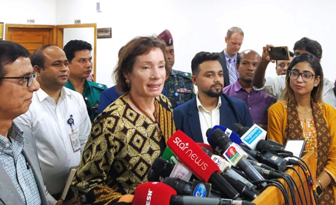 ট্রেসি অ্যান জ্যাকবসন বলেন, প্রথমেই আমি কেন্দ্রীয় ইসিকে ধন্যবাদ জানাতে চাই আমাদের আতিথেয়তা দেওয়ার জন্য। আমি আমার কিছু সহকর্মীকে নিয়ে এখানে এসেছি শুনতে, জানতে এবং বুঝতে। যেহেতু বাইরে অনেক গুজব ও ষড়যন্ত্র তত্ত্ব ছড়িয়ে আছে, আমি খুব স্পষ্টভাবে বলতে চাই যে, যুক্তরাষ্ট্র সরকারের অবস্থান কী।