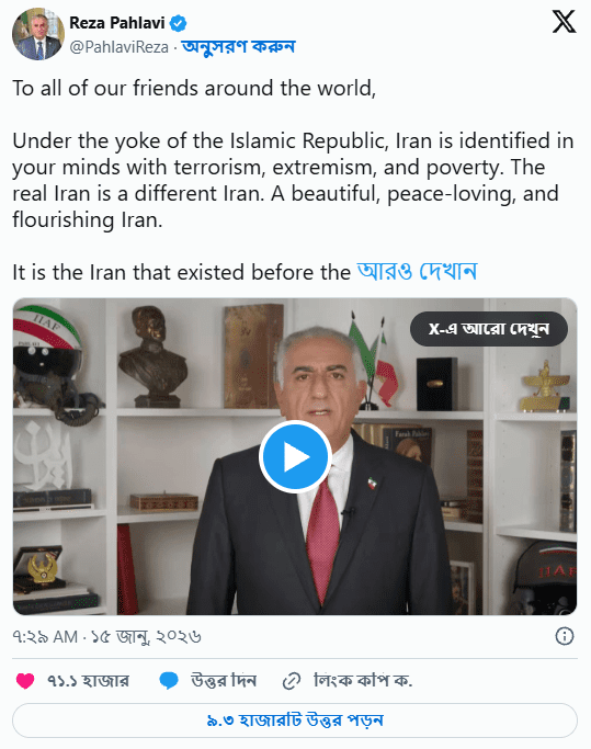 আজ বৃহস্পতিবার সামাজিক যোগাযোগমাধ্যম এক্সে পোস্ট করা এক ভিডিওবার্তায় ইরানের ক্রাউন প্রিন্স বলেন, “বিশ্বজুড়ে ছড়িয়ে থাকা আমাদের বন্ধুরা, ক্ষমতাসীন ইসলামি প্রজাতন্ত্রী সরকারের দাসত্বে থাকতে থাকতে আপনাদের মনে হয়তো ধারণা হয়েছে যে ইরান মানেই সন্ত্রাসবাদ, মৌলবাদ এবং দারিদ্র; কিন্তু এটা ইরানের প্রকৃত চেহারা নয়। সত্যিকারের ইরান হলো একটি সুন্দর, শান্তিপ্রিয় এবং সমৃদ্ধ ইরান, যা ইসলামি প্রজাতন্ত্র ক্ষমতাসীন হওয়ার আগে ছিল।