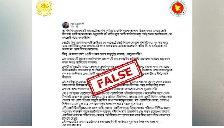 সিএ প্রেস উইং ফ্যাক্টস নামের ভেরিফায়েড ফেসবুক পেজে বলা হয়, ব্র্যাকের নির্বাহী পরিচালক আসিফ সালেহ তার একটি ফেসবুক পোস্টে লিখেছেন, “আপনি কি জানেন এই গণভোটে আপনি কুমিল্লা ও ফরিদপুরকে আলাদা বিভাগ করার জন্যও ভোট দিচ্ছেন?” এই দাবি সত্য নয়। এ দুটি জেলাকে বিভাগ করা হবে কি না তা গণভোটের অংশ নয়।