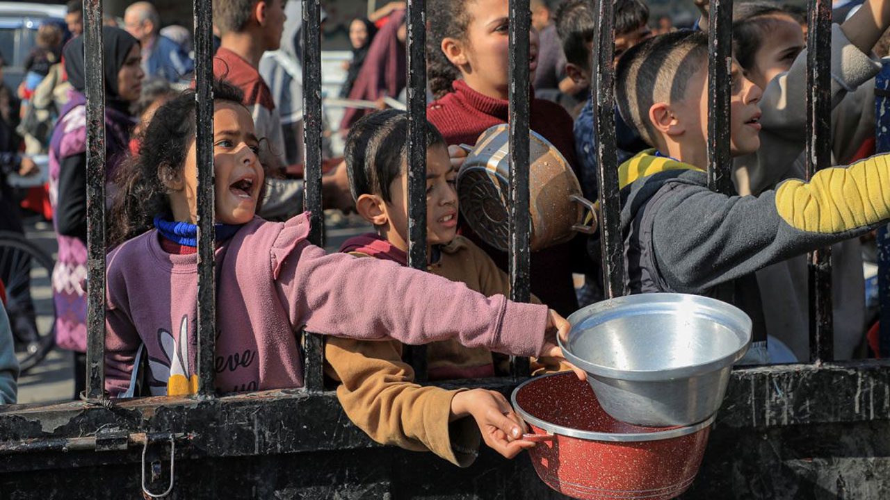 দক্ষিণ গাজা উপত্যকার রাফাহ শহরে খাবার সহায়তা নেওয়ার চেষ্টা করছে শিশুরা। ছবিটি গত বছরের ৩১ ডিসেম্বর তোলা