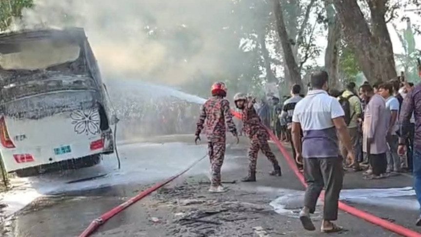 ফায়ার সার্ভিসের স্টেশন অফিসার খোকন জমাদ্দার বলেন, “আমরা ঘটনাস্থলে এসে জানতে পারি, গাড়িতে অগ্নিকাণ্ডের পর যাত্রীরা দ্রুত নামার চেষ্টা করে। গাড়ি থামানোর আগেই অনেকে লাফিয়ে নামতে গেলে একজন চাকার নিচে পিষ্ট হয়ে মারা যান। নিহত ব্যক্তির পরিচয় এখনও জানা যায়নি। বর্তমানে সড়কে যান চলাচল স্বাভাবিক রয়েছে।