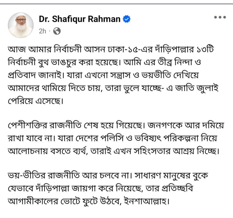 পোস্টে জামায়াত আমির বলেন,‘আজ আমার নির্বাচনী আসন ঢাকা-১৫ আসনের দাঁড়িপাল্লার ১৩টি নির্বাচনী বুথ ভাঙচুর করা হয়েছে। আমি এর তীব্র নিন্দা ও প্রতিবাদ জানাই। যারা এখনো সন্ত্রাস ও ভয়ভীতি দেখিয়ে আমাদের থামিয়ে দিতে চায়, তারা ভুলে যাচ্ছে-এ জাতি জুলাই পেরিয়ে এসেছে।’