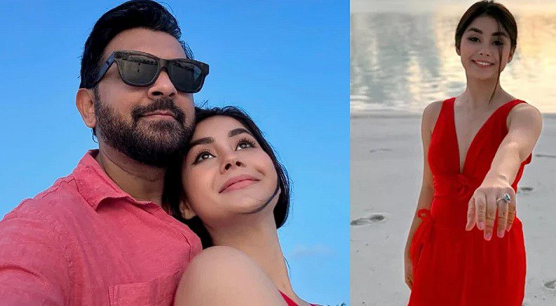 ছবিতে দেখা যায়, রোজা মালদ্বীপের নীল জলরাশি এবং সাদা বালির উপর দাঁড়িয়ে রয়েছেন। সমুদ্র সৈকতে লাল রঙের গাউনে মোহিত রোজা। আর তাহসান হাজির হয়েছেন হালকা গোলাপি শার্টে।
