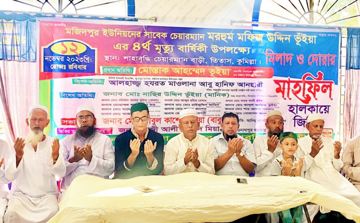 কুমিল্লার দাউদকান্দি উপজেলা বিএনপির সাবেক সহ-সভাপতি, বিশিষ্ট শিক্ষানুরাগী, সমাজসেবী ও তিতাস উপজেলার মজিদপুর ইউনিয়নের সাবেক চেয়ারম্যান মফিজউদ্দিন মঈদর ভুঁইয়া’র ৪র্থ মৃত্যুবার্ষিকী উপলক্ষে দোয়া ও মিলাদ মাহফিল অনুষ্ঠিত হয়েছে।