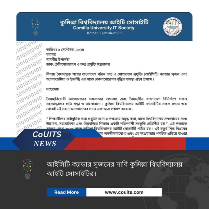 নাহিদ ইসলামকে বিসিএসে আইসিটি ক্যাডারের পদ সৃষ্টিসহ চার দফা দাবি জানিয়েছে কুমিল্লা বিশ্ববিদ্যালয় (কুবি) আইটি সোসাইটি।