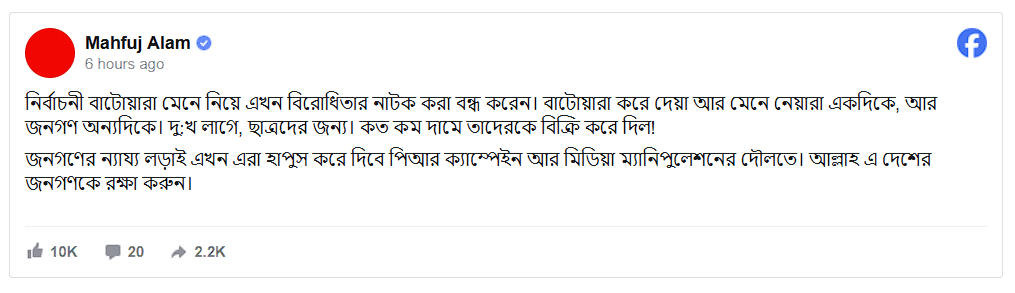 ফেসবুক পোস্টে মাহফুজ লিখেছেন, ‘নির্বাচনী বাটোয়ারা মেনে নিয়ে এখন বিরোধিতার নাটক করা বন্ধ করেন। বাটোয়ারা করে দেয়া আর মেনে নেয়ারা একদিকে, আর জনগণ অন্যদিকে। দু:খ লাগে, ছাত্রদের জন্য। কত কম দামে তাদেরকে বিক্রি করে দিল!