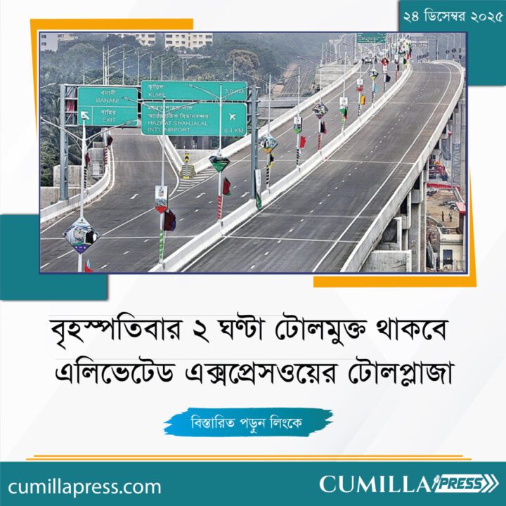 আগামীকাল বৃহস্পতিবার (২৫ ডিসেম্বর) বেলা ১২টা থেকে দুপুর ২টা পর্যন্ত ঢাকা শহরে প্রবেশের জন্য বিমানবন্দর এলাকার এলিভেটেড এক্সপ্রেসওয়ের টোলপ্লাজা সাধারণের জন্য টোল মুক্ত থাকবে।