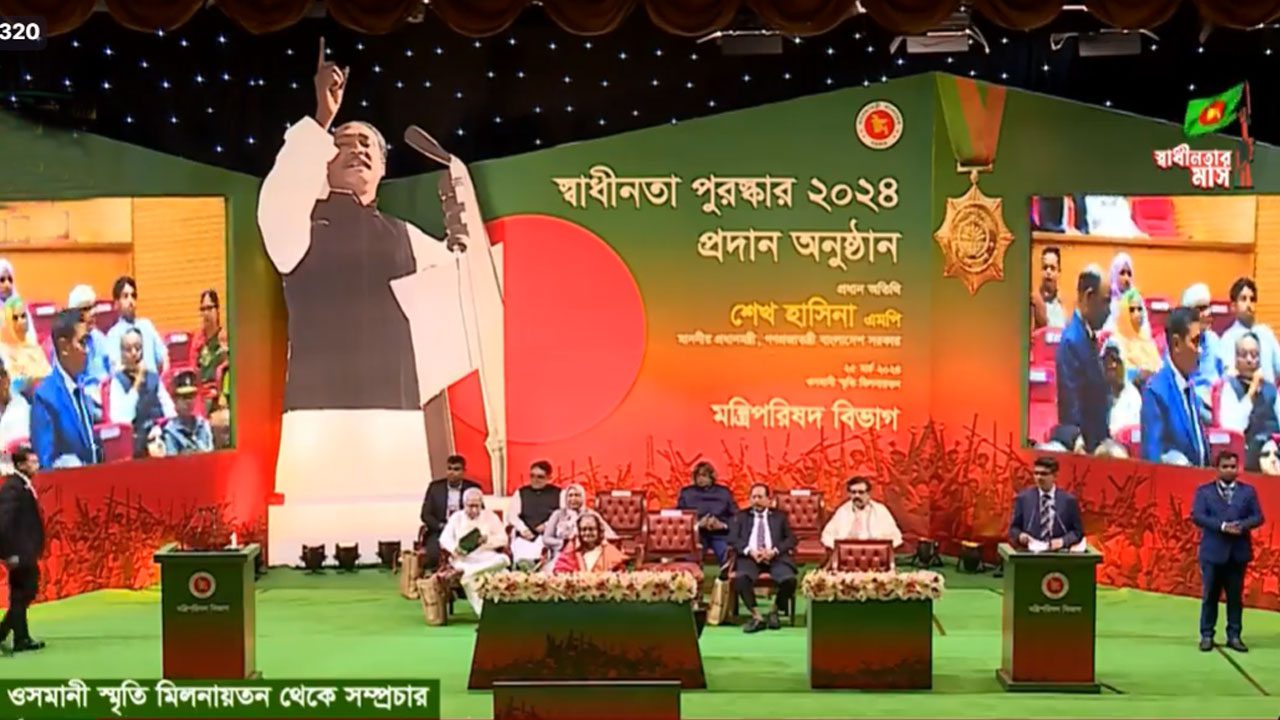 সোমবার (২৫ মার্চ) সকালে রাজধানীর ওসমানী স্মৃতি মিলনায়তনে ‘স্বাধীনতা পুরস্কার-২০২৪’ অনুষ্ঠানে পুরস্কার বিতরণ করা হয়।