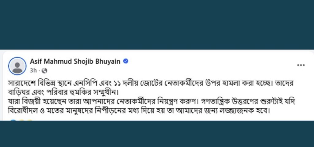 পোস্টে তিনি লিখেন, সারাদেশে বিভিন্ন স্থানে এনসিপি এবং ১১ দলীয় জোটের নেতাকর্মীদের ওপর হামলা করা হচ্ছে। তাদের বাড়িঘর এবং পরিবার হুমকির সম্মুখীন। যারা বিজয়ী হয়েছেন তারা আপনাদের নেতাকর্মীদের নিয়ন্ত্রণ করুণ। গণতান্ত্রিক উত্তরণের শুরুটাই যদি বিরোধীদল ও মতের মানুষদের নিপীড়নের মধ্য দিয়ে হয় তা আমাদের জন্য লজ্জাজনক হবে।