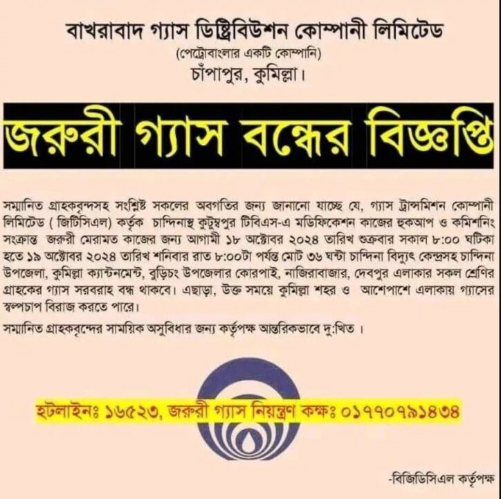 এক বিজ্ঞপ্তিতে কুমিল্লার বাখরাবাদ গ্যাস ডিস্ট্রিবিউশন কোম্পানি লিমিটেড জানায়, গ্যাস ট্রান্সমিশন কোম্পানি লিমিটেড (জিটিসিএল) কর্তৃক চান্দিনাস্থ কুটুম্বপুর টিবিএস-এ মডিফিকেশন কাজের হুকআপ ও কমিশনিং সংক্রান্ত জরুরি মেরামত কাজের জন্য আগামী শুক্রবার (১৮ অক্টোবর) সকাল ৮টা থেকে শনিবার (১৯ অক্টোবর) রাত ৮টা পর্যন্ত মোট ৩৬ ঘণ্টা চান্দিনা বিদ্যুৎ কেন্দ্রসহ চান্দিনা উপজেলা, কুমিল্লা ক্যান্টনমেন্ট, বুড়িচং উপজেলার কোরপাই, নাজিরাবাজার, দেবপুর এলাকার সব শ্রেণির গ্রাহকের গ্যাস সরবরাহ বন্ধ থাকবে। এ ছাড়া, ওই সময়ে কুমিল্লা শহর ও আশপাশে এলাকায় গ্যাসের স্বল্পচাপ বিরাজ করতে পারে।