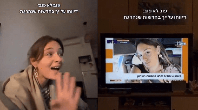 ইসরাইলি একটি টেলিভিশন চ্যানেলে ইরানের বিক্ষোভে নিজের মৃত্যুর খবর দেখে হতবাক হয়ে যান এক ইসরাইলি তরুণী।