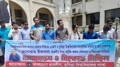 আব্দুল্লাহ, কুবি প্রতিনিধি: কুমিল্লা বিশ্ববিদ্যালয় সাংবাদিক সমিতি'র অর্থ-সম্পাদক ইকবাল মনোয়ার ছাত্রলীগ নিয়ে 'কটুক্তি' করার প্রতিবাদ ও বিচারের দাবিতে মানববন্ধন ও বিক্ষোভ মিছিল করেছে কুবি শাখা ছাত্রলীগের (রেজা-স্বজন) একাংশ। বুধবার (৩১…