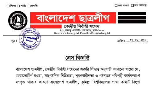 আব্দুল্লাহ, কুবি প্রতিনিধি: কুমিল্লা বিশ্ববিদ্যালয় (কুবি) শাখা ছাত্রলীগের কমিটি বিলুপ্তি ঘোষণা করা হয়েছে। আজ মঙ্গলবার (৬ মার্চ) কেন্দ্রীয় ছাত্রলীগের সভাপতি সাদ্দাম হোসেন ও সাধারণ সম্পাদক শেখ ওয়ালী আসিফ ইনান সাক্ষরিত…